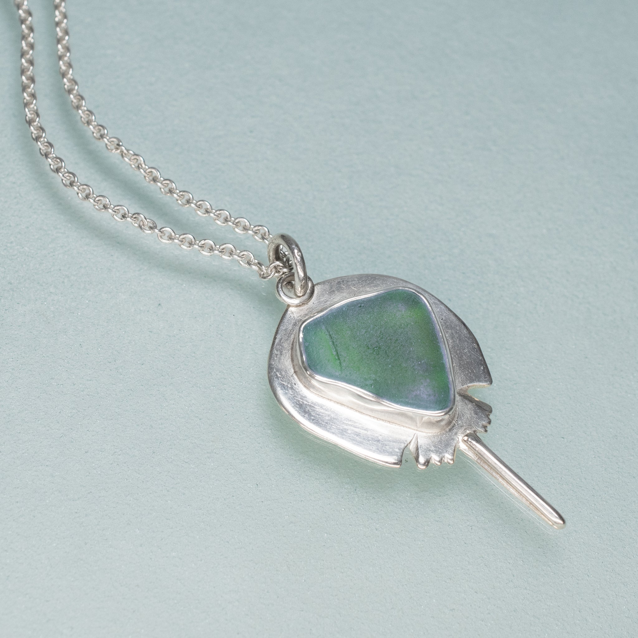 The Sea Glass Horseshoe Crab necklace is hand sawn from recycled sheet silver using your favorite color sea glass.