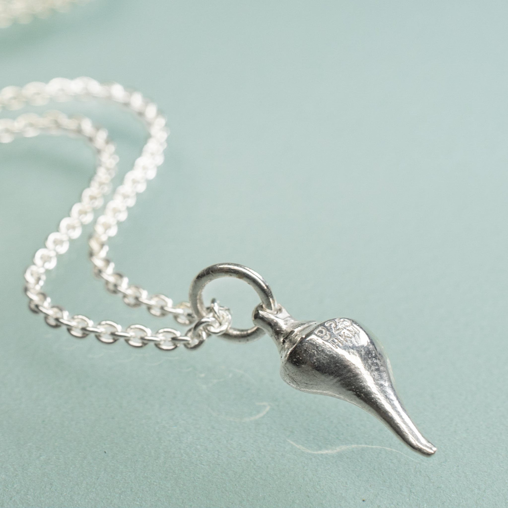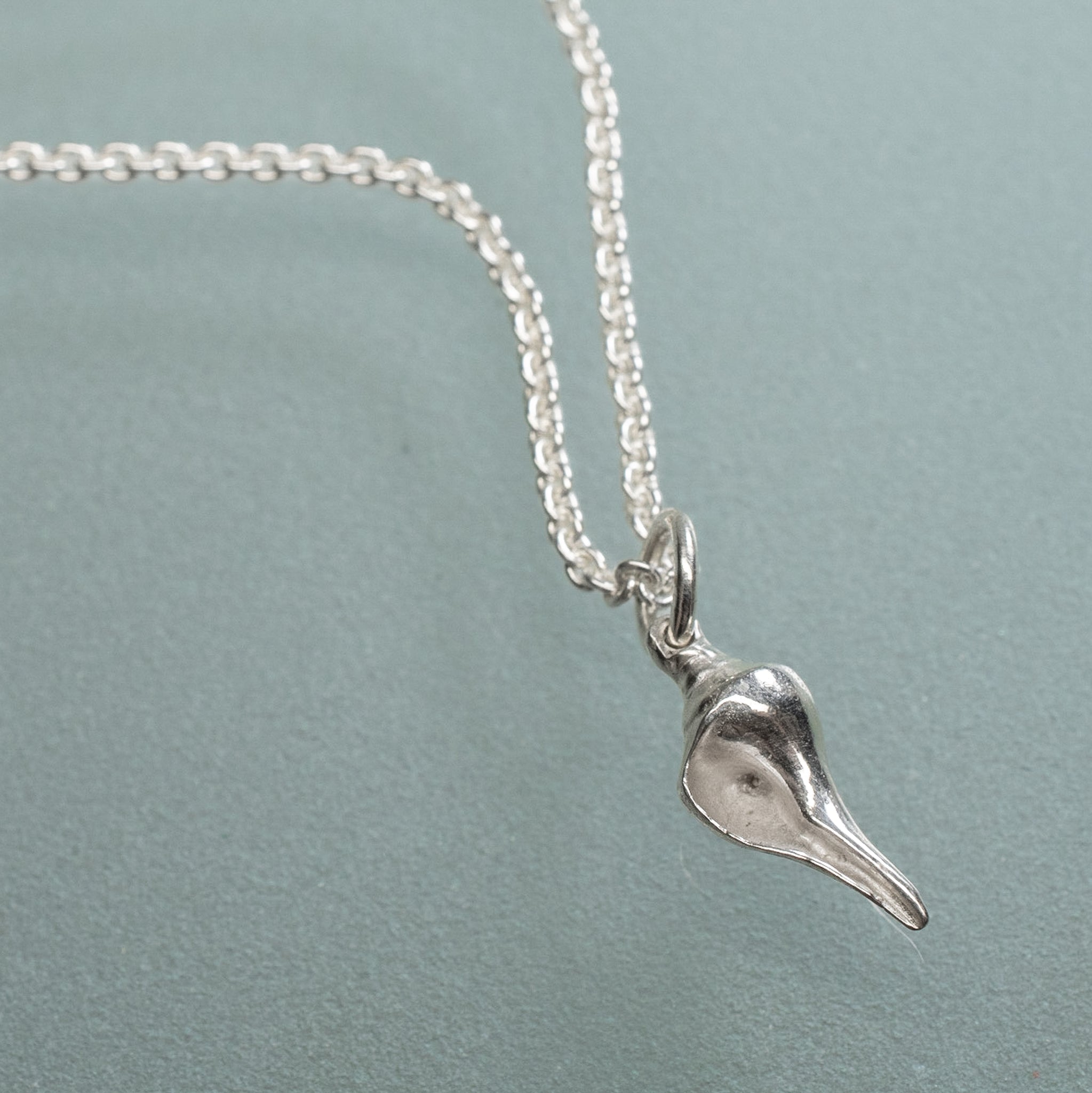 This little Lightning Whelk Necklace is made from the molding and casting of a real found seashell in recycled silver. Once the casting is created, I solder on jump rings and it is then strung on a 16”, 18” or 20” sterling silver cable chain of your choice.