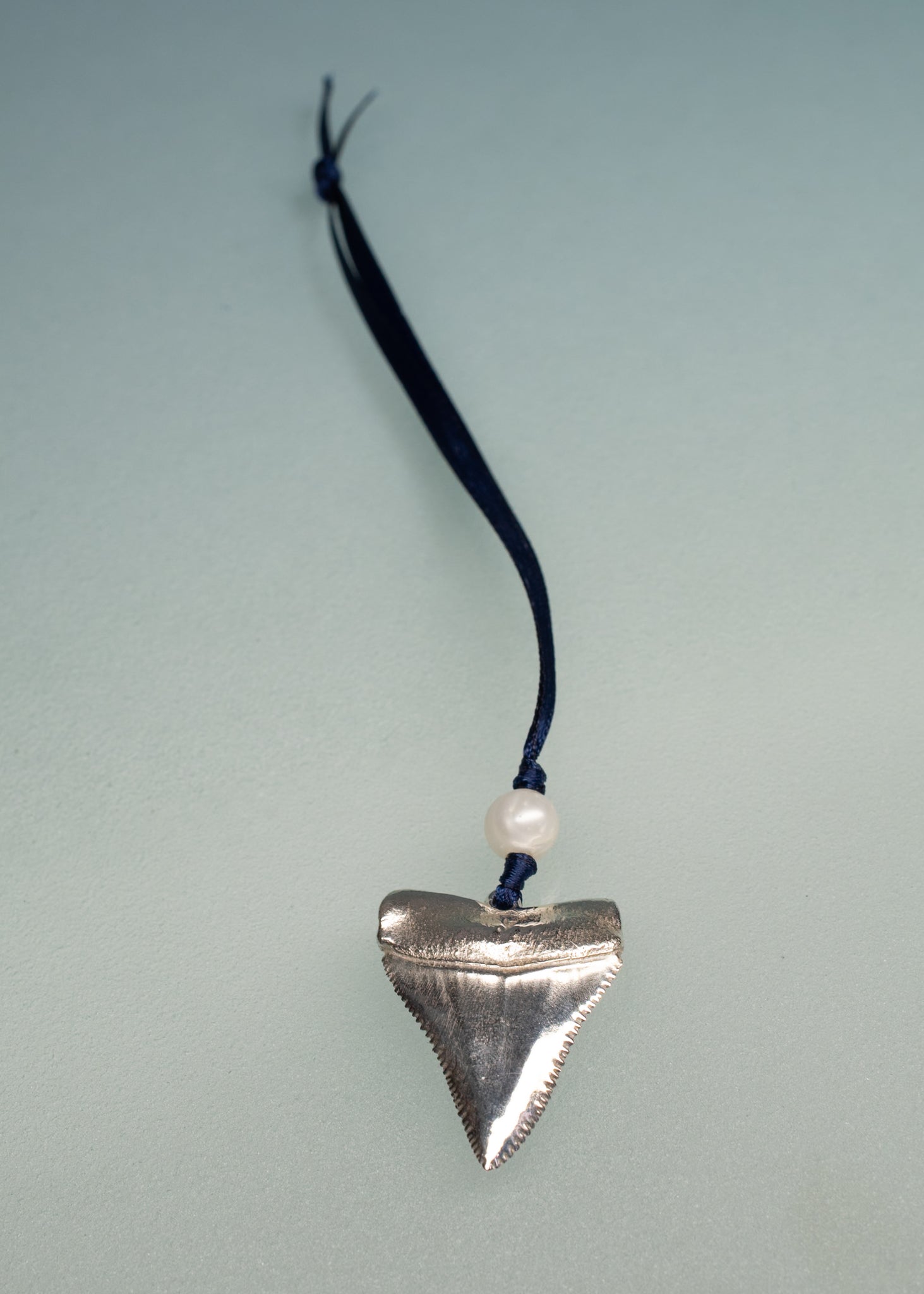 Silver shark tooth ornament with a pearl on a black cord against a light gray background