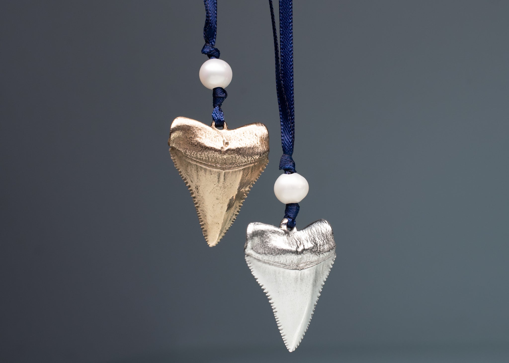 Two shark tooth ornaments on blue cords with white beads against a gray background