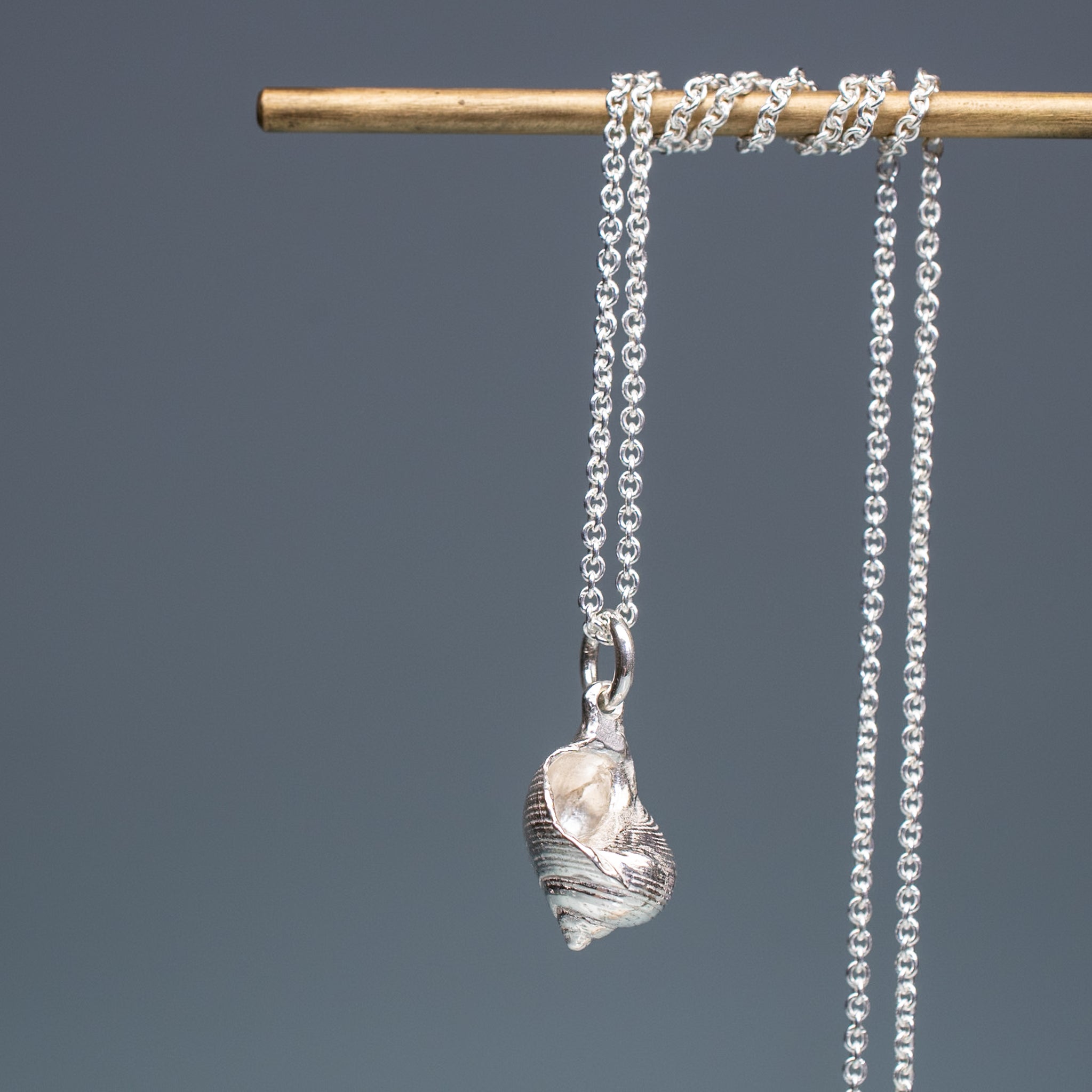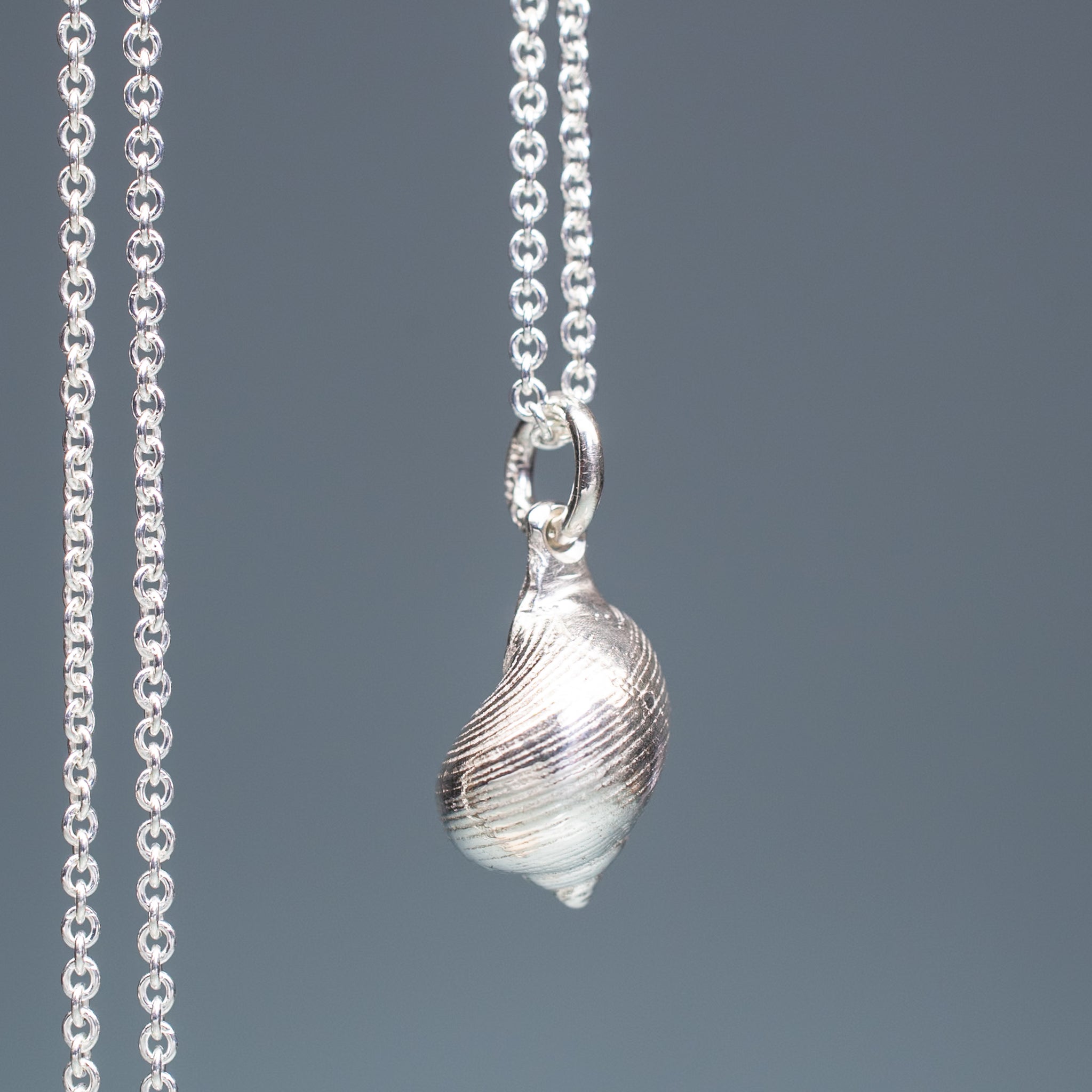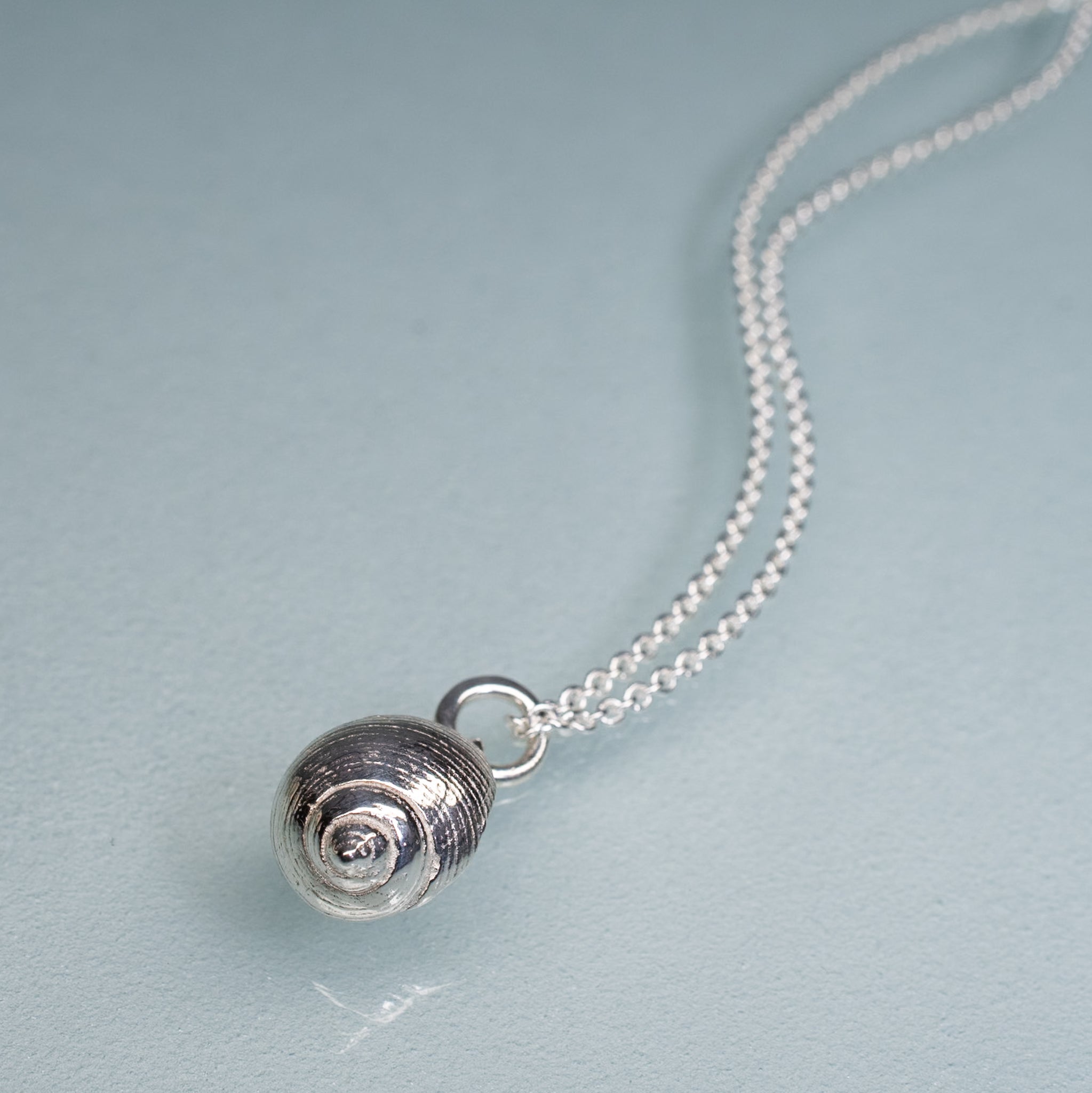 The Periwinkle Shell Necklace is made from the molding and casting of a real common periwinkle snail shell in recycled silver. A friend found the original in Maine.