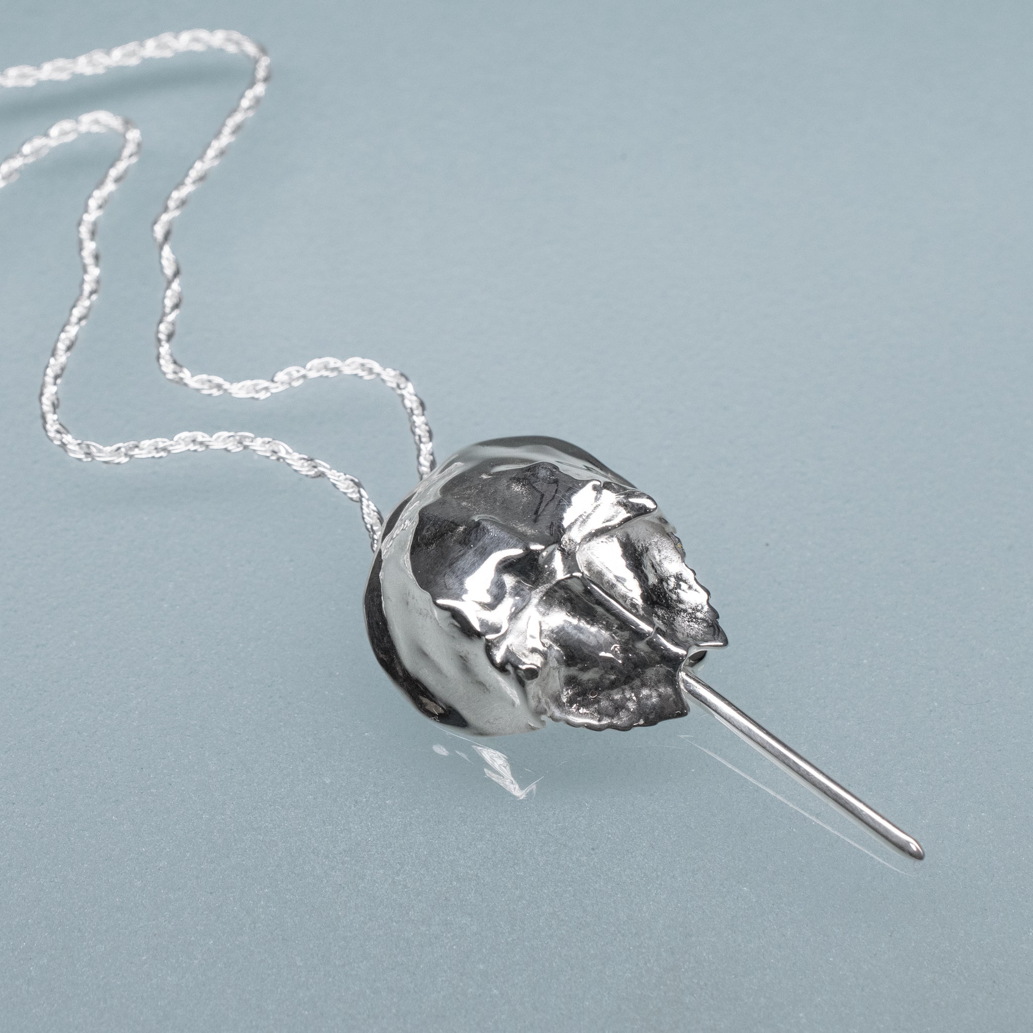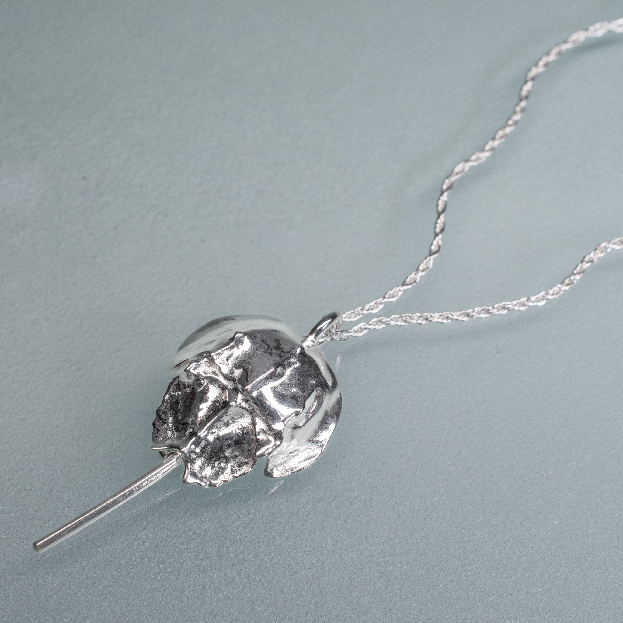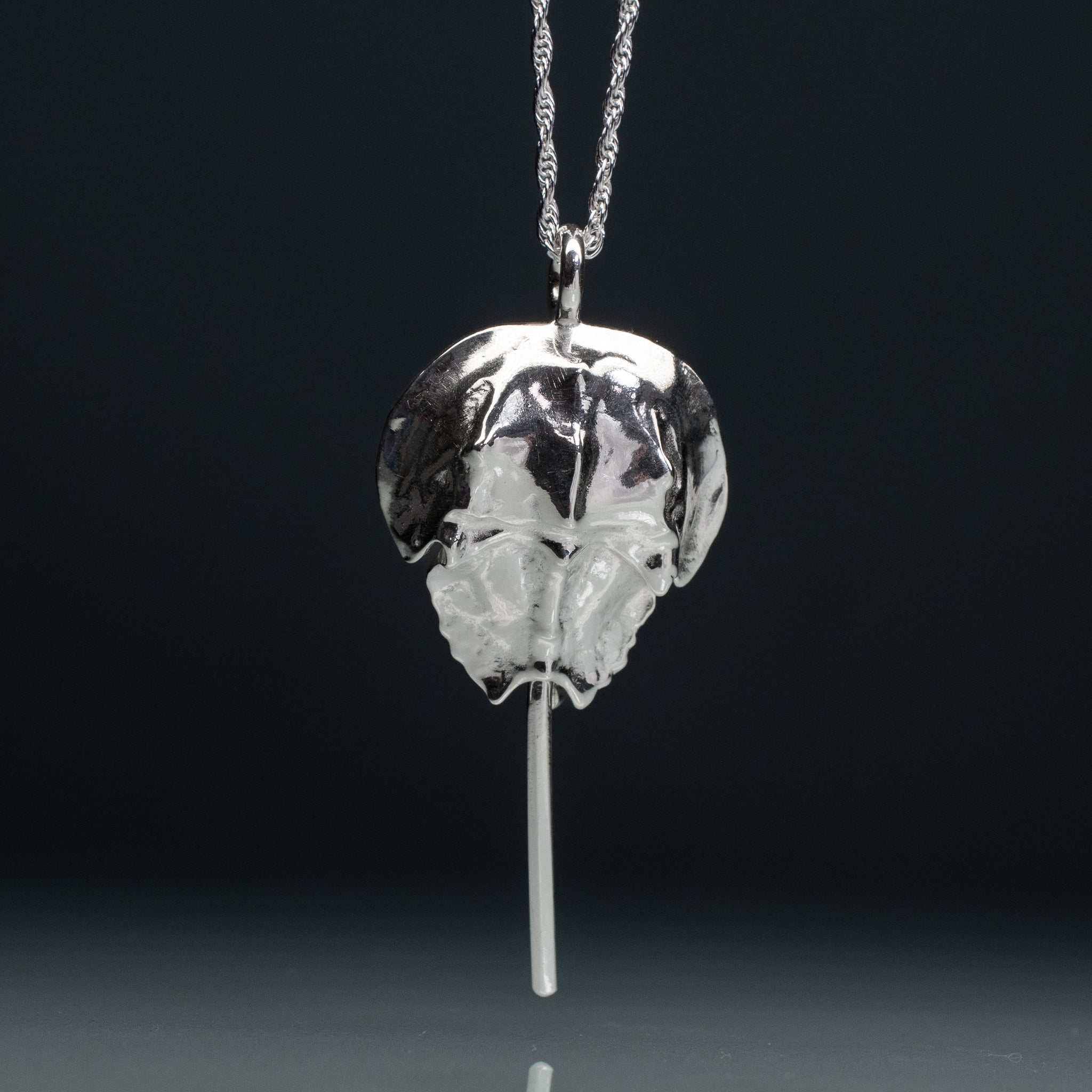 The Large Horseshoe Crab Necklace is made from the molding and casting of a real baby Horseshoe Crab molt in recycled sterling silver.