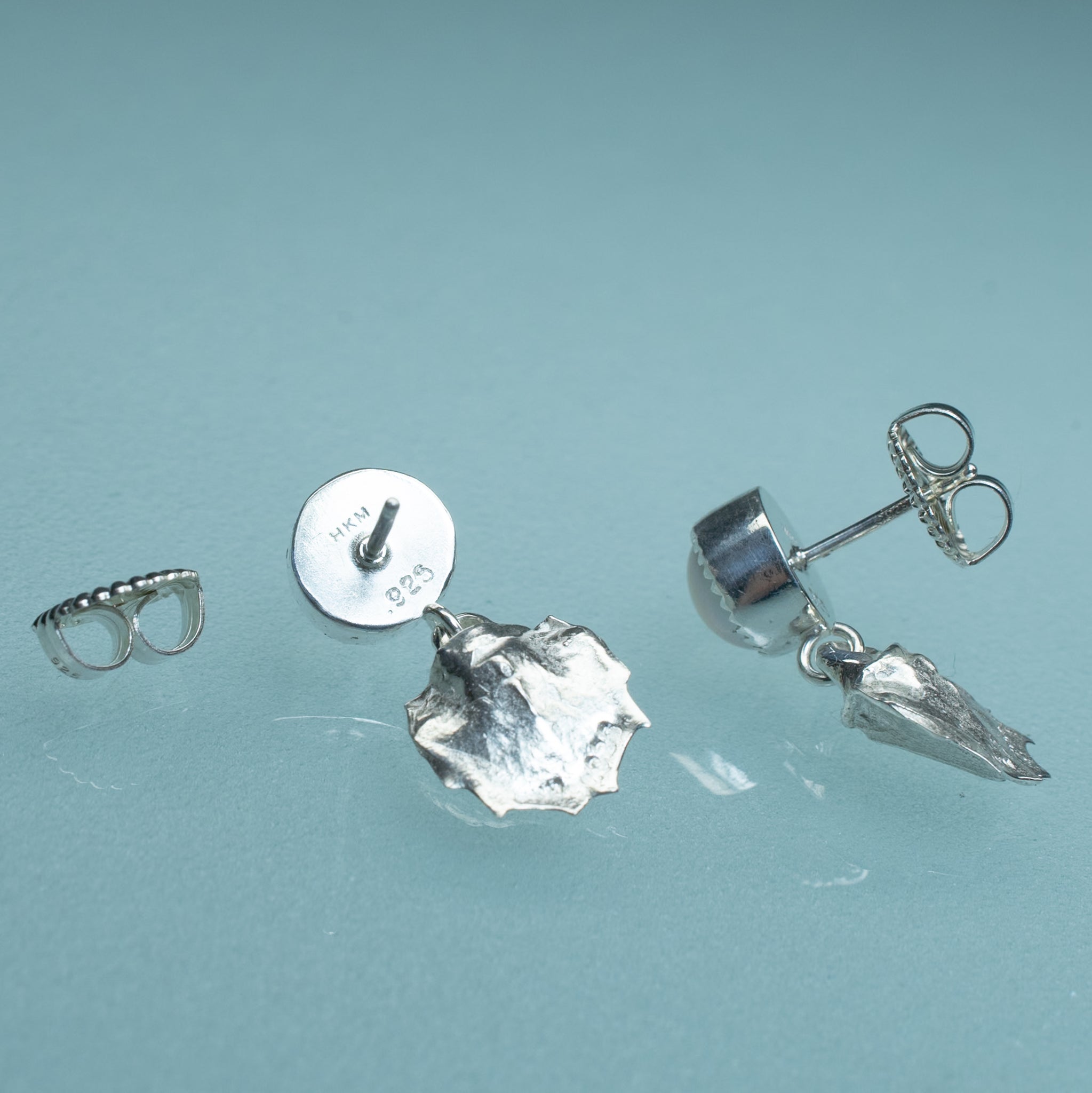 These Mantis Shrimp Tail Pearl Drops are made from the molding and casting of a real found mantis shrimp molt in recycled silver. The original empty molt was collected on a beach in Cape May, NJ.