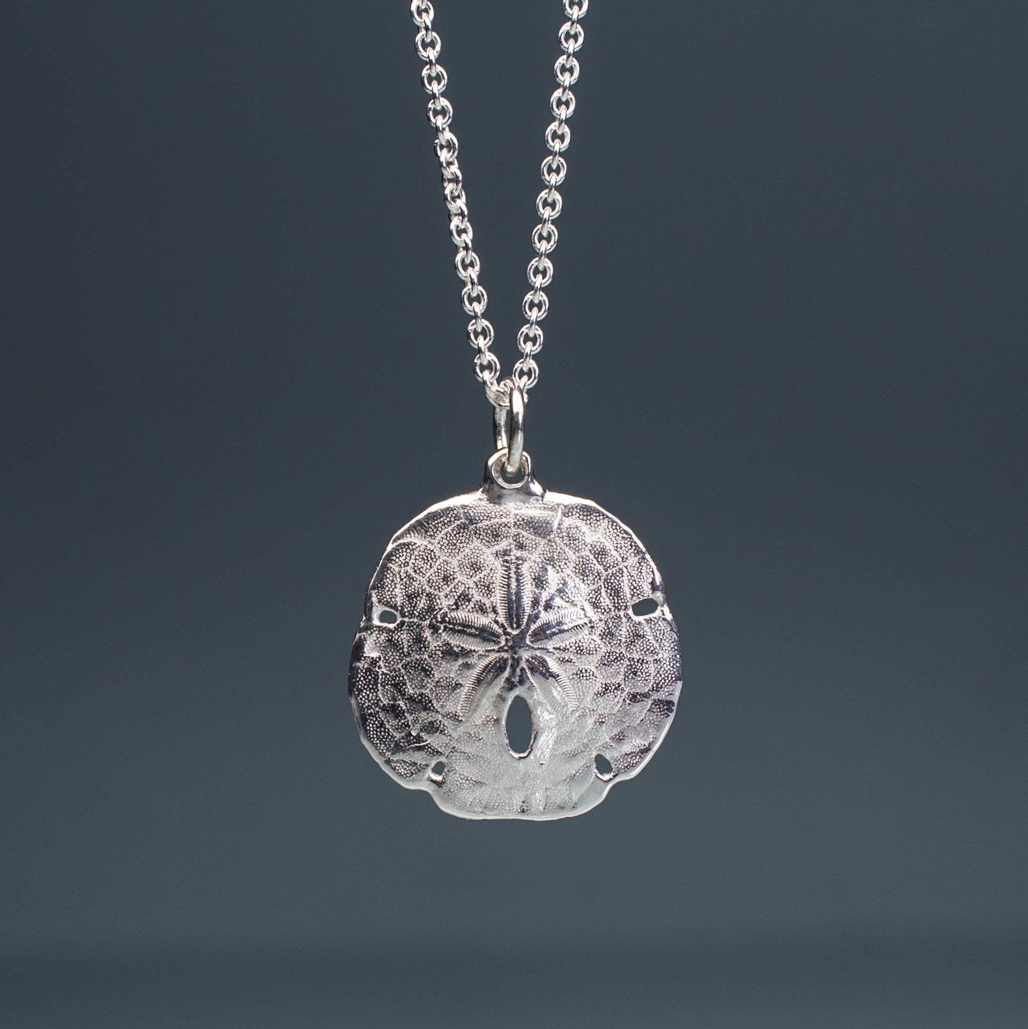 The Small Sand Dollar Necklace is made from the molding and casting of a real five-hole sand dollar in recycled silver. A friend found the original in Florida.
