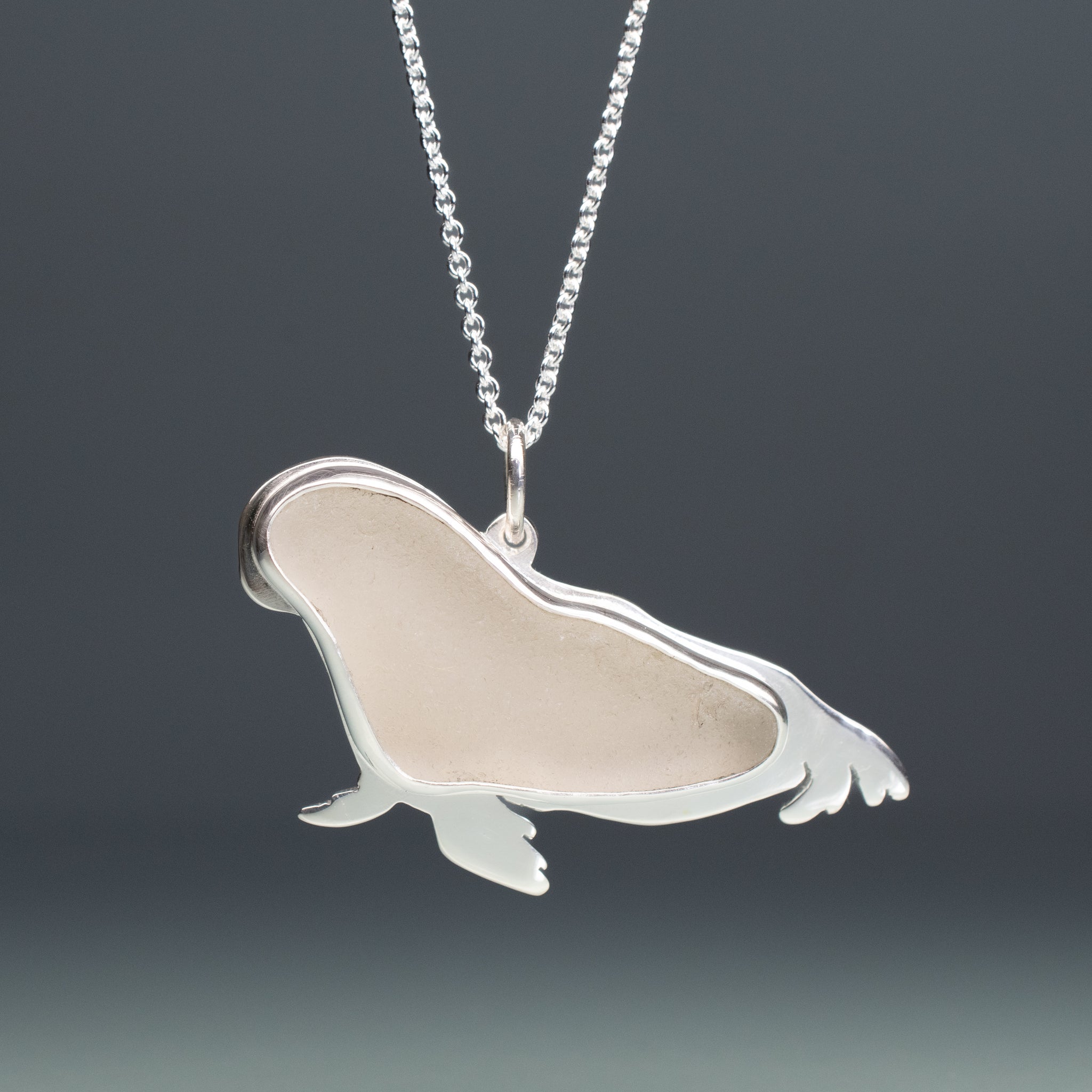 This Sea Glass Sea Lion necklace is hand sawn from recycled sheet silver. The beach-found authentic Sea Glass shard is bezel set securely in place and the entire piece is polished with care. The sea glass shard is white in color, and was collected by a friend in Gloucester, MA. Some sea lions can hold their breath for up to 20 minutes in the wild.