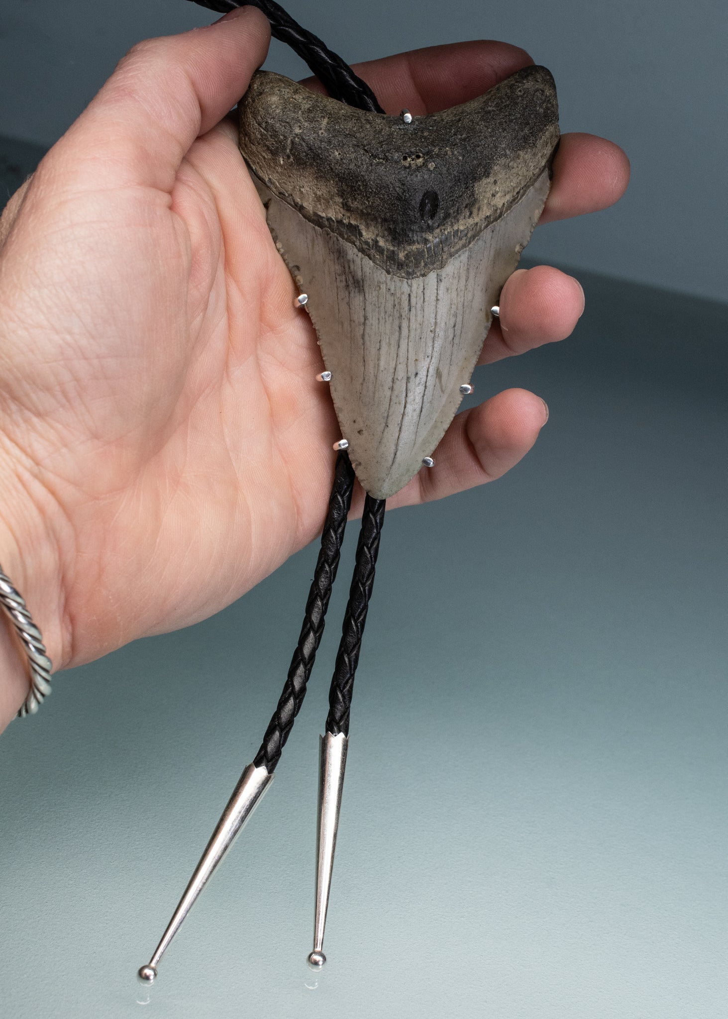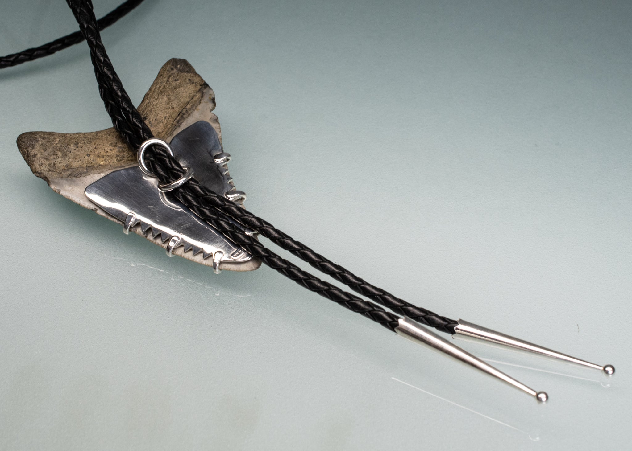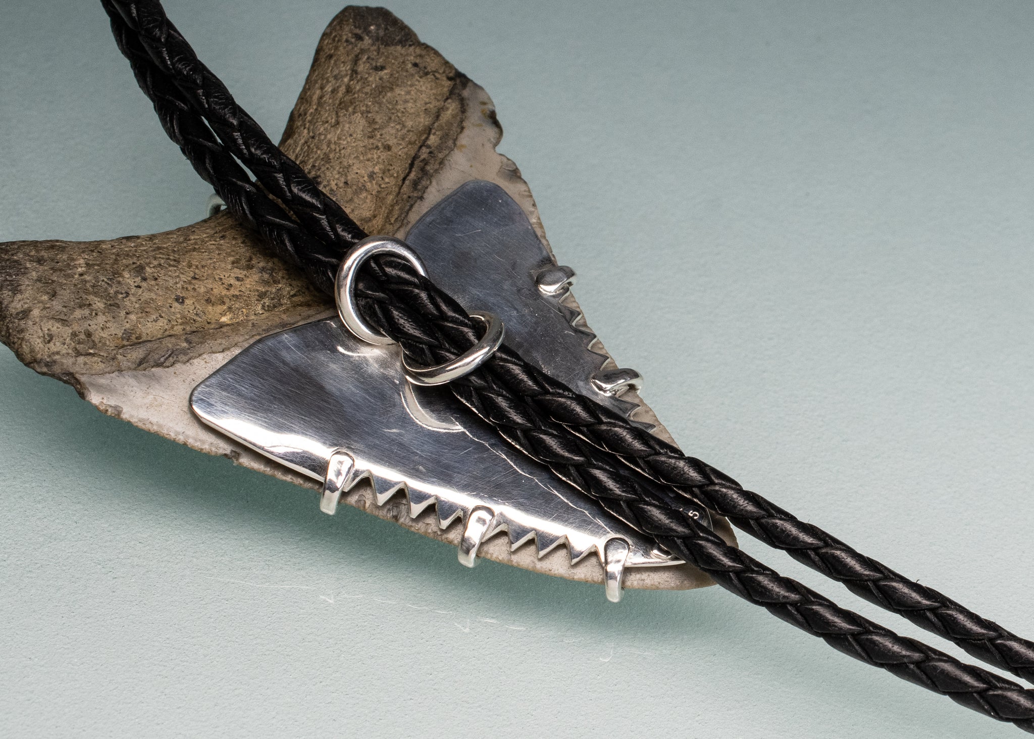 This fossil tooth was found by a professional sharktooth diver in the rivers of Charleston, SC. I created a custom silver prong setting and bolo backing with braided leather cord and sterling end caps.